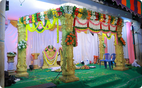 We create custom mandaps based on your wedding theme, colour palette, and personal preferences. From regal Rajasthani designs to elegant garden-style mandaps, your dream vision is our blueprint.